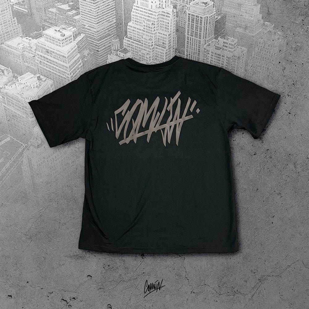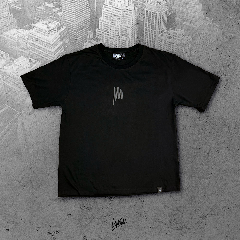 Polera boxy fit manga corta detalles de serigrafía puff frontal con gran acabado de nuestro isotipo emblema “M”; serigrafía trasera artesanal biselada de nuestro nombre estilo grafiti, COMÚN.