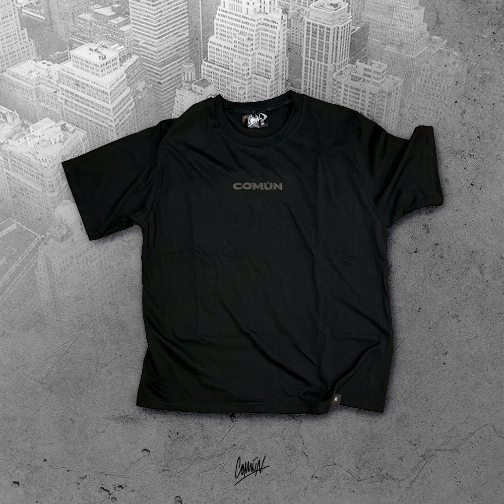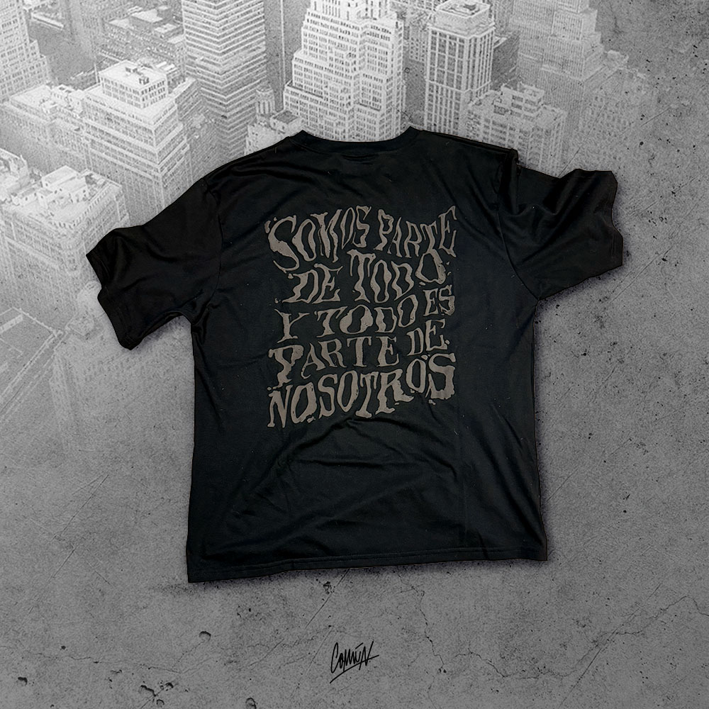 Polera boxy fit manga corta detalles de serigrafía puff frontal con gran acabado de nuestro nombre COMÚN; serigrafía trasera artesanal biselada de nuestro tag “Somos parte de todo y todo es parte de nosotros”.